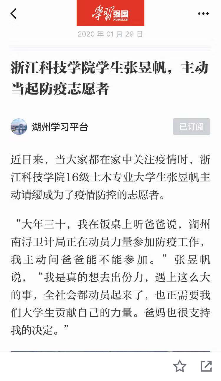 原文链接:浙江科技学院学生张昱帆,主动当起防疫志愿者