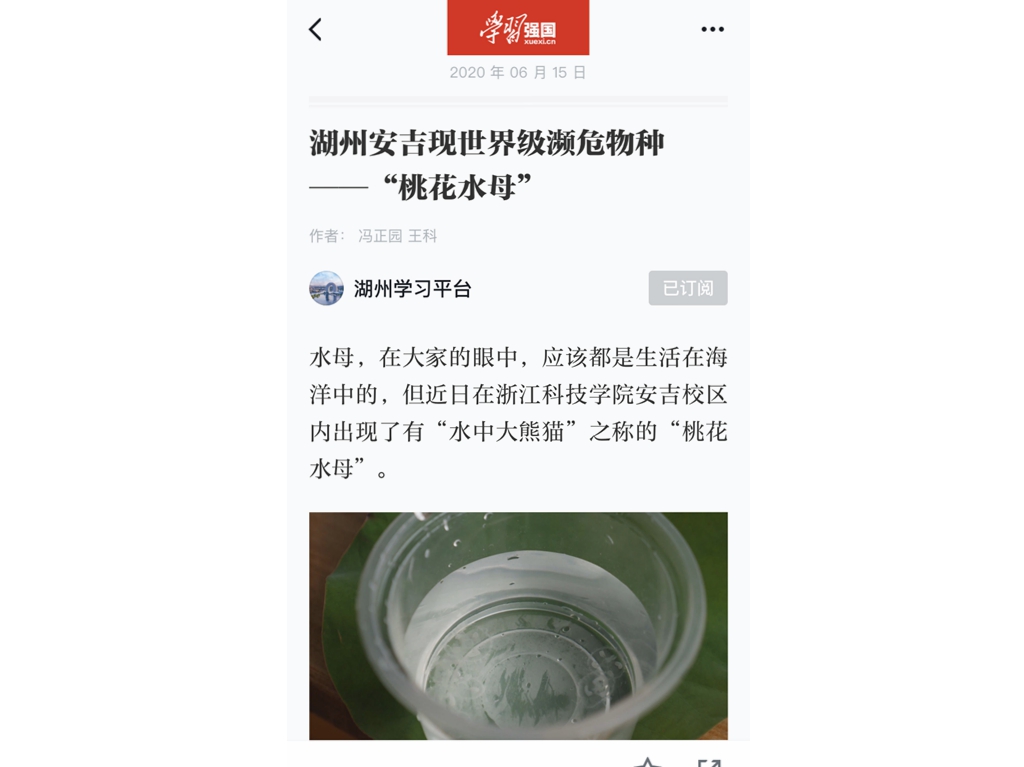 近日,学习强国和浙江卫视正午播报栏目等媒体关注米乐官网安吉校区出现了有“水中大熊猫”之称的“桃花水母”。