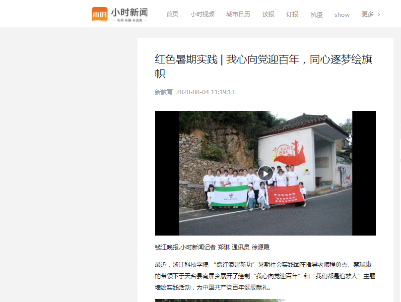 近日,浙江科技学院学生团队在暑期来临之际,利用自身的专业技能,在台州市天台县南屏乡开展了以“我心向党 迎百年”为主题的红色墙绘活动。以一面面特色墙绘表达师生对党的美好祝福。学习强国、小时新闻等媒体对活动进行了报道:学习强国:嗨·自拍丨会“讲故事”的红色墙绘、小时新闻:红色暑期实践 | 我心向党迎百年,同心逐梦绘旗帜。