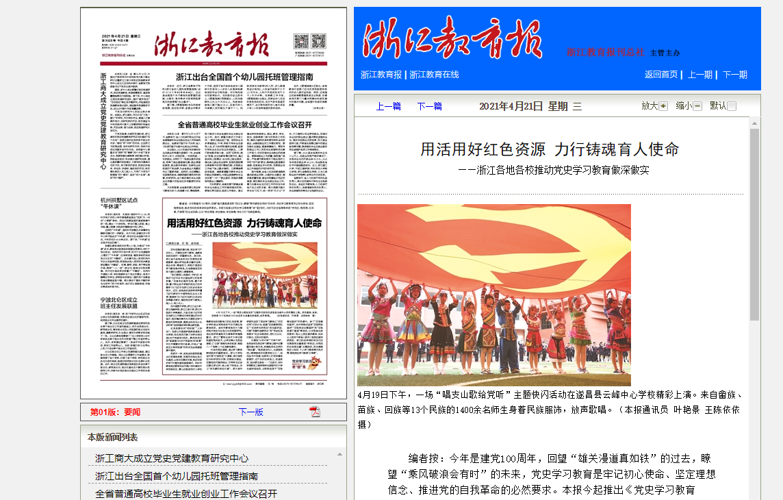 编者按:今年是建党100周年,回望“雄关漫道真如铁”的过去,瞭望“乘风破浪会有时”的未来,党史学习教育是牢记初心使命、坚定理想信念、推进党的自我革命的必然要求。本报今起推出《党史学习教育看“浙”里》专栏,及时刊发全省教育系统“学党史、悟思想、办实事、开新局”的生动实践,以及“学史明理、学史增信、学史崇德、学史力行”的典型事例。