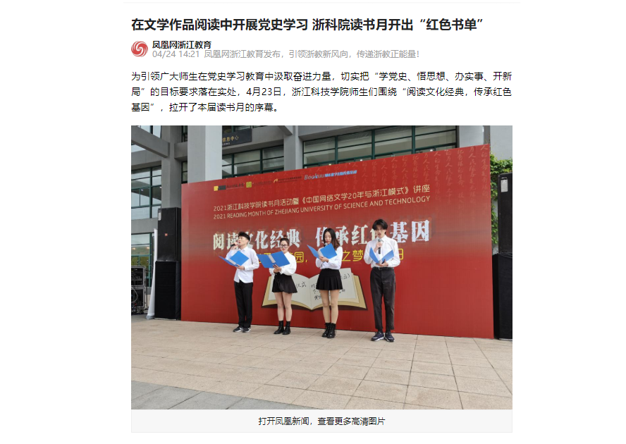 为引领广大师生在党史学习教育中汲取奋进力量,切实把“学党史、悟思想、办实事、开新局”的目标要求落在实处,4月23日,浙江科技学院师生们围绕“阅读文化经典,传承红色基因”,拉开了本届读书月的序幕。