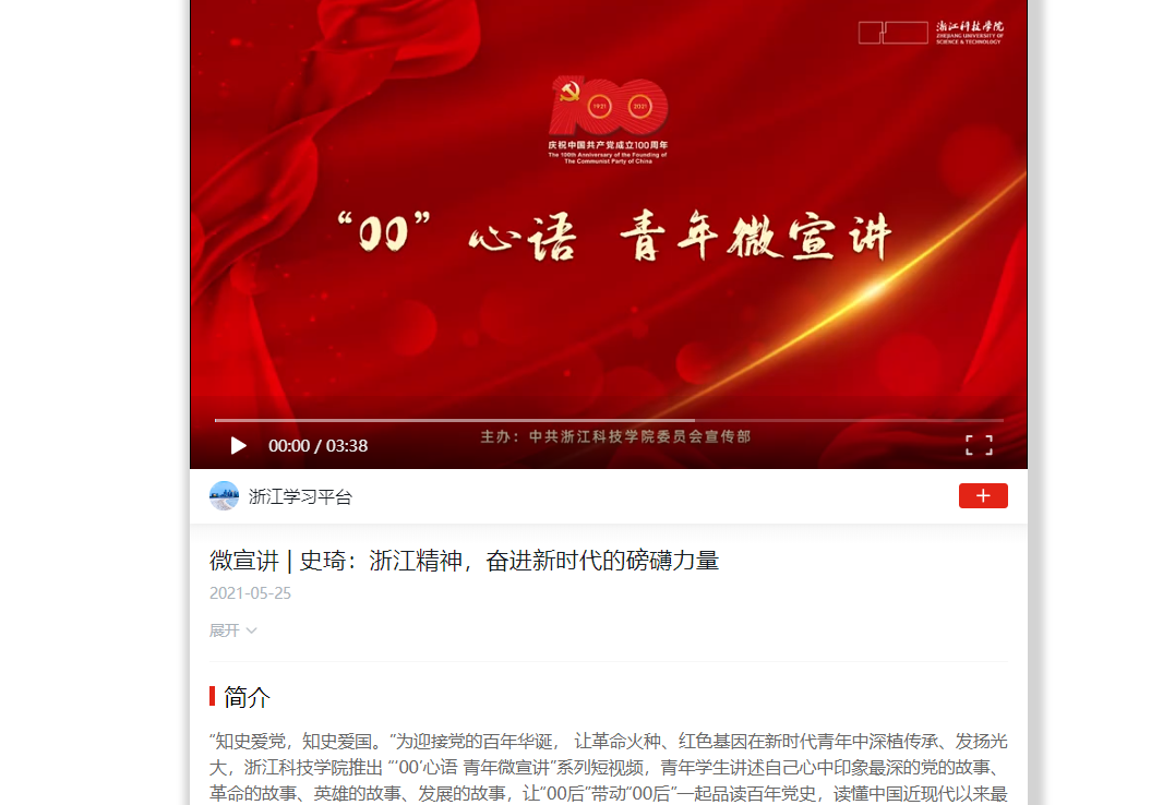 “知史爱党,知史爱国。”为迎接党的百年华诞, 让革命火种、红色基因在新时代青年中深植传承、发扬光大,浙江科技学院推出 “‘00’心语 青年微宣讲”系列短视频,请青年学生讲述自己心中印象最深的党的故事、革命的故事、英雄的故事、发展的故事,让“00后”带动“00后”一起品读百年党史,读懂中国近现代以来最为可歌可泣的篇章,读出重点,读出味道。