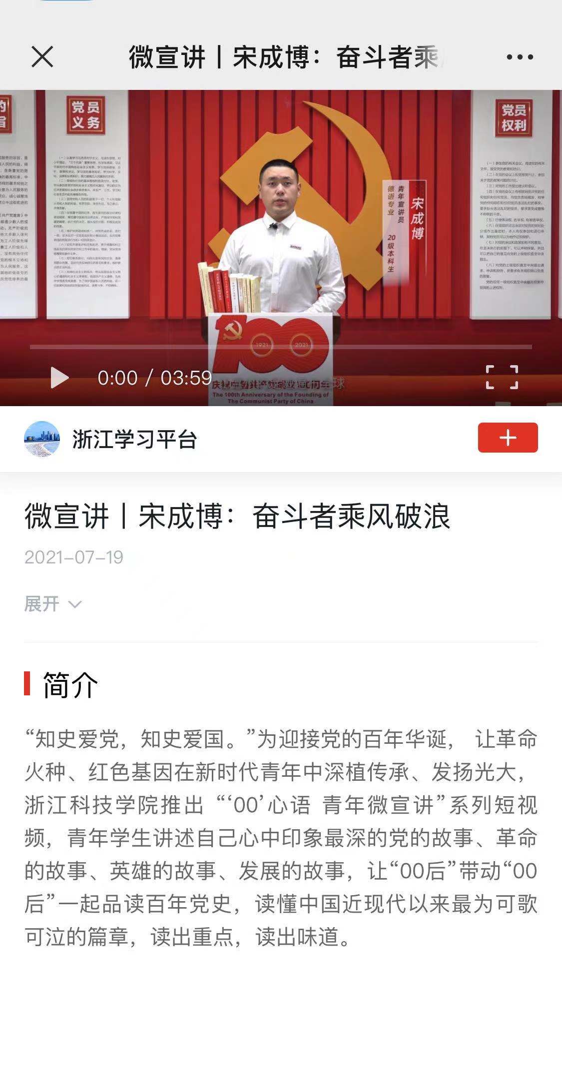 “知史爱党,知史爱国。”为迎接党的百年华诞, 让革命火种、红色基因在新时代青年中深植传承、发扬光大,浙江科技学院推出 “‘00’心语 青年微宣讲”系列短视频,青年学生讲述自己心中印象最深的党的故事、革命的故事、英雄的故事、发展的故事,让“00后”带动“00后”一起品读百年党史,读懂中国近现代以来最为可歌可泣的篇章,读出重点,读出味道。