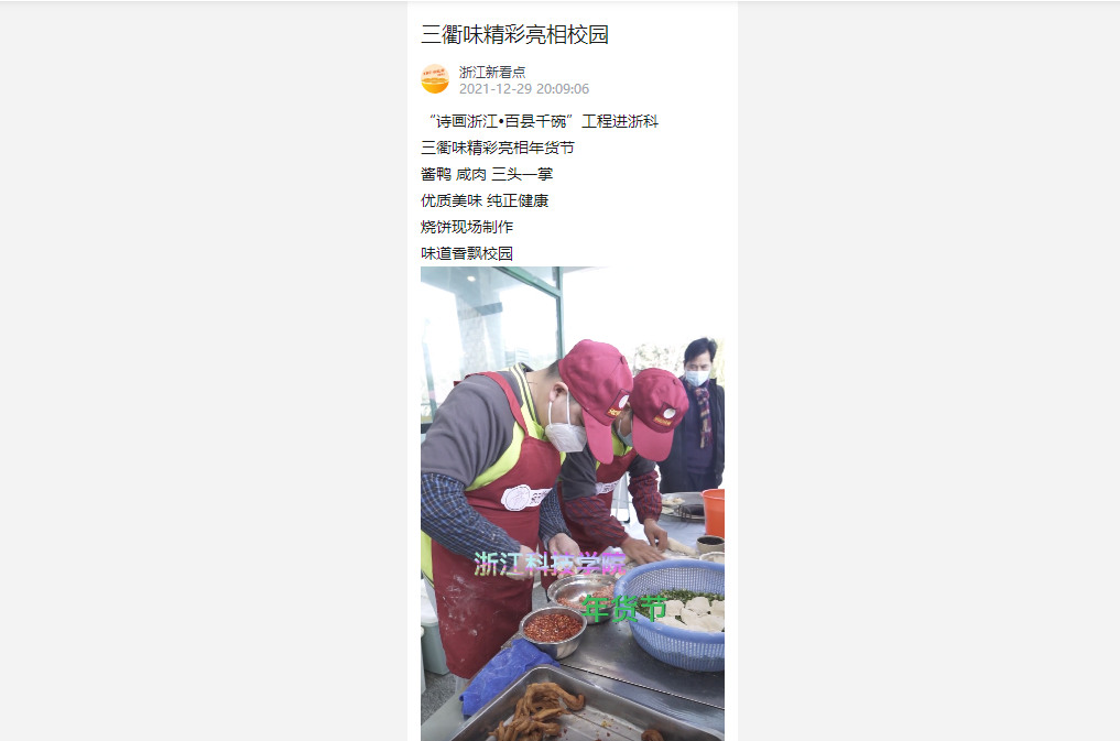 “诗画浙江·百县千碗”进浙科活动于2021年12月29-31日在小和山校区举行,让师生在校园里品年味儿。小时新闻、天目新闻·浙江新看点等媒体对活动进行了报道: