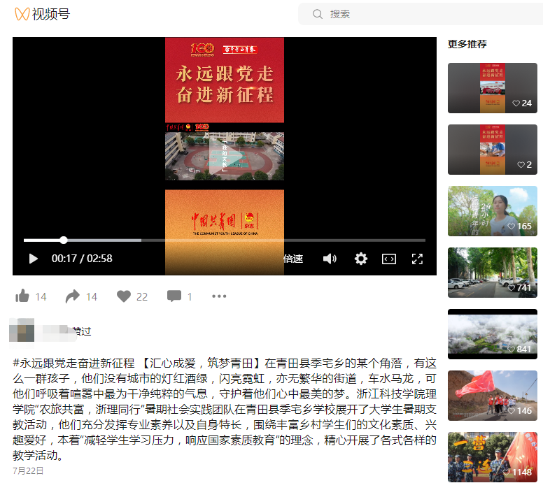 近日,浙江科技学院“农旅共富,浙理同行”暑期社会实践团在青田县季宅乡,开展了大学生暑期支教、以“喜迎二十大,永远跟党走,奋进新征程”为主题的红色教育活动日等实践服务活动。理学院还与青田县季宅乡正式建立“研学基地”。活动受到学习强国、中国共青团杂志·视频号、央视影音、小时新闻、青春浙江·视频号等平台关注。