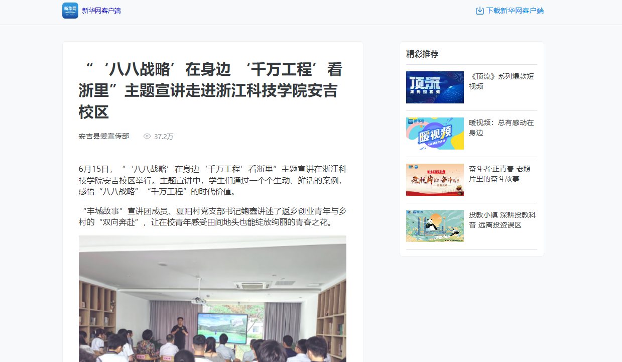 新华网客户端:“‘八八战略’在身边 ‘千万工程’看浙里”主题宣讲走进浙江科技学院安吉校区