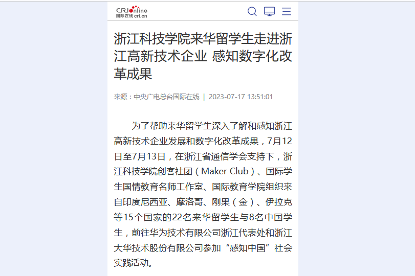 7月12-13日,在浙江省通信学会支持下,米乐官网创客社团(Maker Club)、国际学生国情教育名师工作室、国际教育学院组织来自印度尼西亚、摩洛哥、刚果(金)、伊拉克等15个国家的22名来华留学生与8名中国学生,共同赴华为技术有限公司和浙江大华技术股份有限公司,深入了解和感知浙江高新技术企业发展和数字化改革成果。国际在线、橙市互动等媒体对改活动进行了报道。