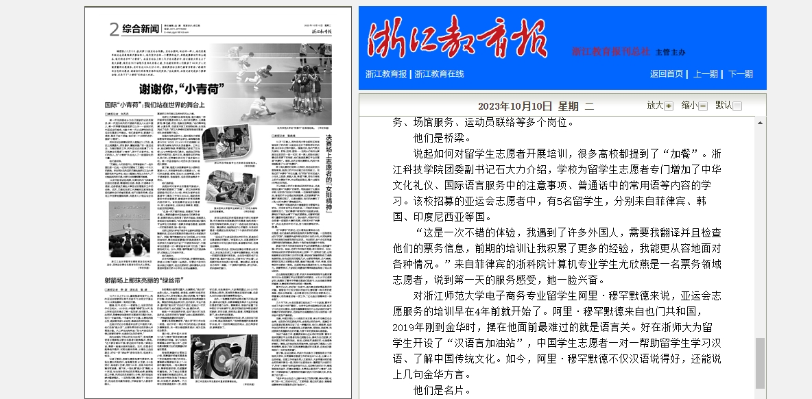 说起如何对留学生志愿者开展培训,很多高校都提到了“加餐”。浙江科技学院团委副书记石大力介绍,学校为留学生志愿者专门增加了中华文化礼仪、国际语言服务中的注意事项、普通话中的常用语等内容的学习。该校招募的亚运会志愿者中,有5名留学生,分别来自菲律宾、韩国、印度尼西亚等国。