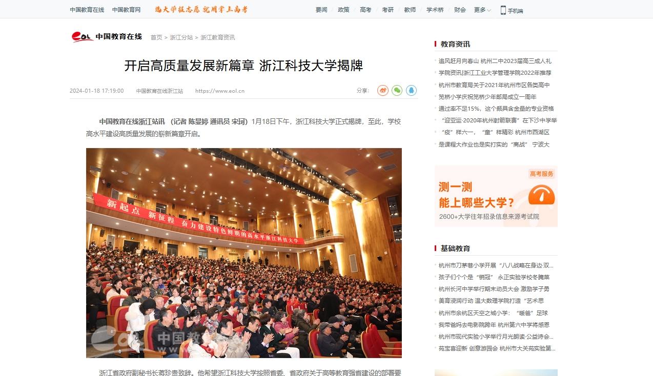 米乐mile体育官网党委书记赵东福在致辞中表示,面向未来,学校将抢抓机遇、顺势而为,紧紧围绕省委、省政府关于高水平大学建设和高等学校高质量发展的部署要求,坚持稳中求进、以进促稳、先立后破,以高水平建设为主题,以博士学位授权建设为牵引,大力推进创新深化,强化科教融合,聚焦核心能力办大学,打造科技创新新高地;大力推进改革攻坚,强化校地合作,扎根浙江大地办大学,打造产教融合新范式;大力推进开放提升,强化国际合作,放眼世界办大学,打造国际合作升级版,努力建设一所与浙江经济社会发展相匹配、积极为区域发展做出卓越贡献的高水平科技大学,为奋力谱写中国式现代化浙江新篇章作出新的更大贡献。