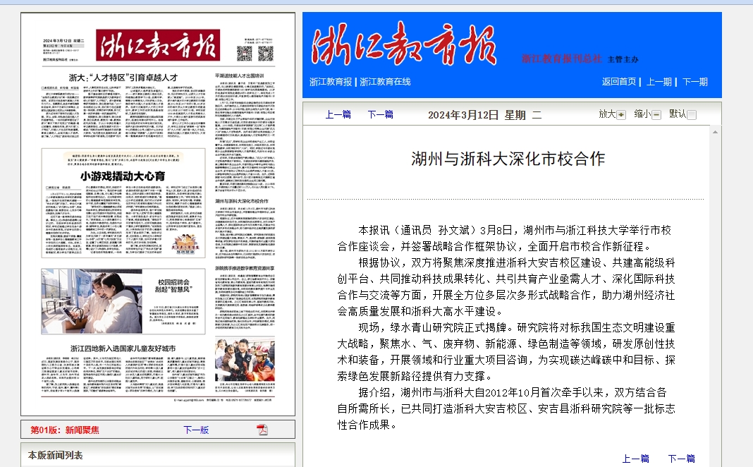 据介绍,湖州市与浙科大自2012年10月首次牵手以来,双方结合各自所需所长,已共同打造浙科大安吉校区、安吉县浙科研究院等一批标志性合作成果。