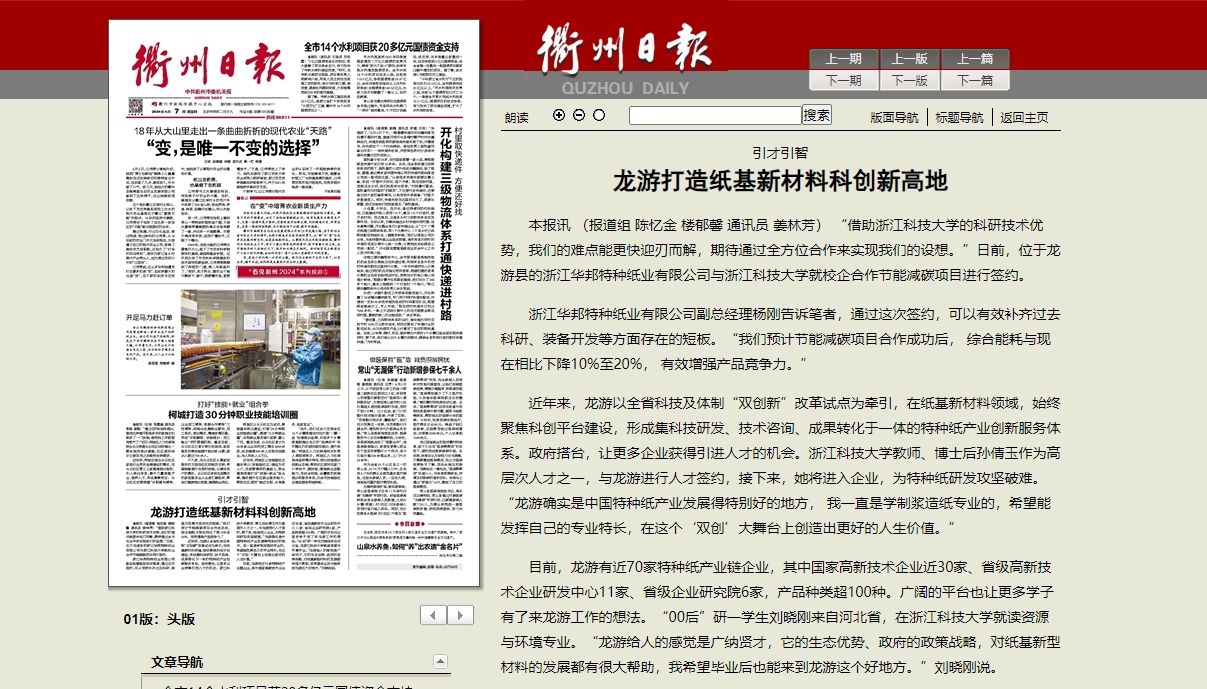 目前,龙游有近70家特种纸产业链企业,其中国家高新技术企业近30家、省级高新技术企业研发中心11家、省级企业研究院6家,产品种类超100种。广阔的平台也让更多学子有了来龙游工作的想法。“00后”研一学生刘晓刚来自河北省,在米乐mile体育官网就读资源与环境专业。“龙游给人的感觉是广纳贤才,它的生态优势、政府的政策战略,对纸基新型材料的发展都有很大帮助,我希望毕业后也能来到龙游这个好地方。”刘晓刚说。