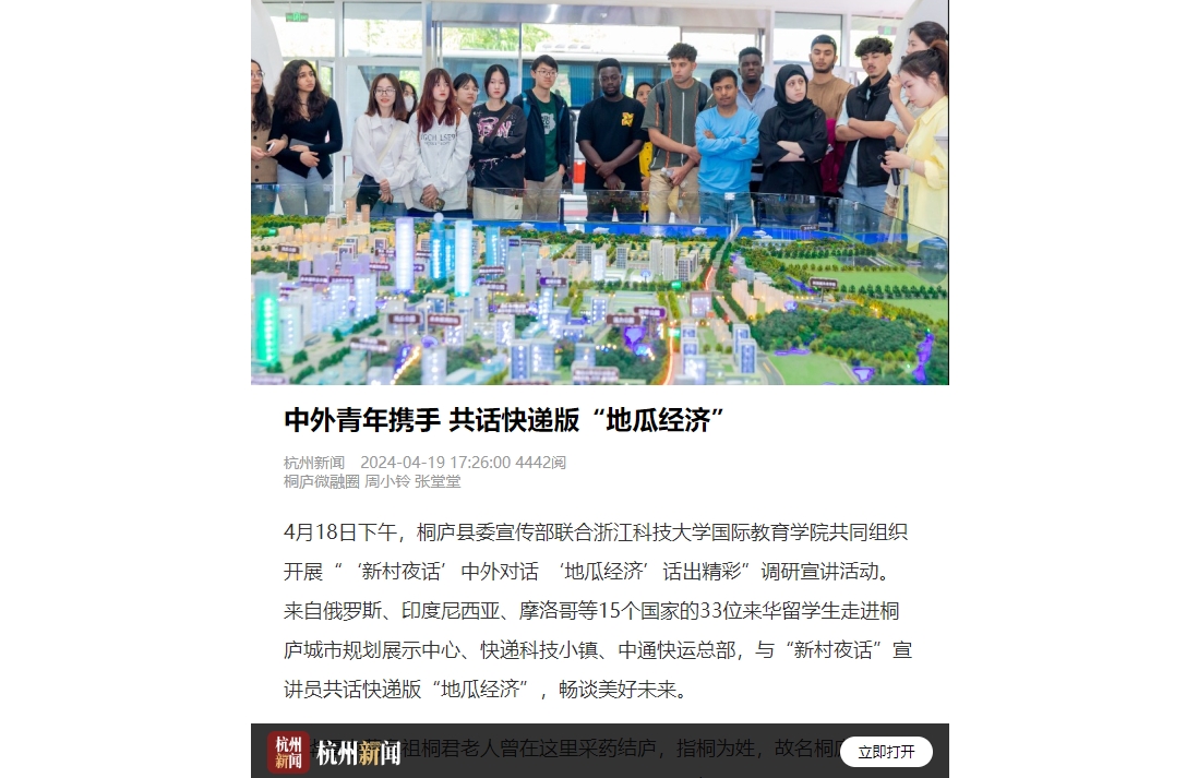4月18日下午,桐庐县委宣传部联合米乐mile体育官网国际教育学院共同组织开展“‘新村夜话’中外对话 ‘地瓜经济’话出精彩”调研宣讲活动。来自俄罗斯、印度尼西亚、摩洛哥等15个国家的33位来华留学生走进桐庐城市规划展示中心、快递科技小镇、中通快运总部,与“新村夜话”宣讲员共话快递版“地瓜经济”,畅谈美好未来。