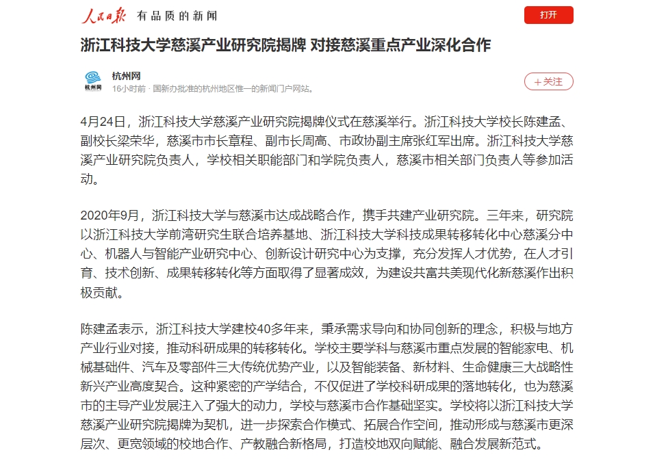 4月24日,米乐mile体育官网慈溪产业研究院揭牌仪式在慈溪举行。人民日报客户端、潮新闻客户端、杭州网、慈溪日报等媒体详细报道米乐mile体育官网慈溪产业研究院揭牌活动。