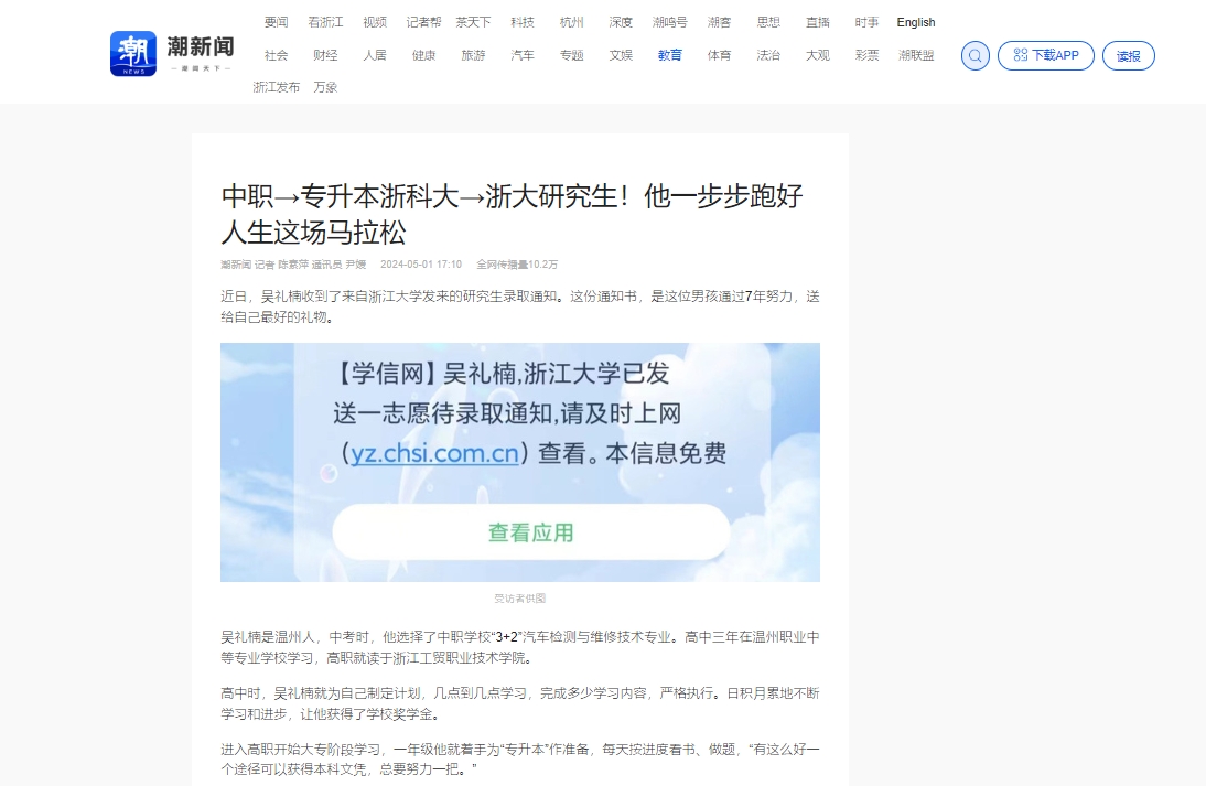 钱江晚报公众号:温州男生大逆袭!中职→专升本浙科大→浙大研究生!