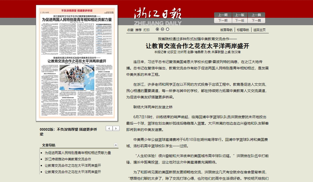 在浙江,许多老师和同学正在以不同的方式投身于这项工程中。教育是促进人文交流、民心相通的重要渠道,每一所参与其中的学校,都在持续努力拓展中美教育人文交流渠道,为促进中美友好搭建更多桥梁。