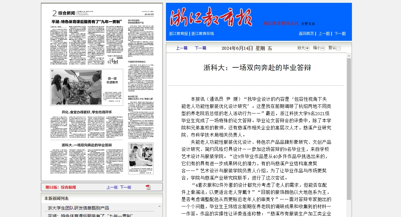 “我毕业设计的内容是‘包容性视角下失能老人功能性服装优化设计研究’。这是我在前期调研了杭绍两地不同类型的养老院后总结的老人活动行为……”最近,米乐mile体育官网9名2021级毕业生完成了一场特殊的论文答辩。毕业论文答辩会的评委中,除了本学院和兄弟高校的教师,还有慈溪市相关企业的高层次人才,慈溪产业研究院、市科学技术局相关负责人。