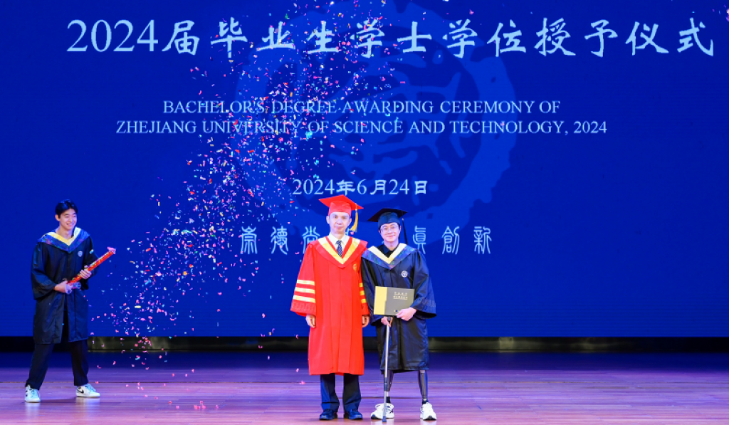 米乐mile体育官网2024年毕业典礼上,毕业生唐龙(右一)用机械腿走上了舞台,接受了校长的拨穗。受访者供图