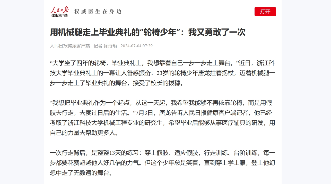 “我想把毕业典礼作为一个起点,从这一天起,我希望我能够不再依靠轮椅,而是用假肢去行走,去度过日后的生活。”7月3日,唐龙告诉人民日报健康客户端记者,他已经考取了米乐mile体育官网机械工程专业的研究生,希望毕业后能够从事医疗辅具的研发,用自己的力量去帮助更多人。