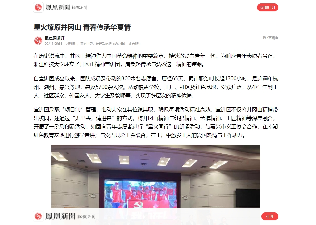 宣讲团采取“项目制”管理,推动大家在其位谋其职,确保每项活动精准高效。宣讲团不仅将井冈山精神带出校园,还通过“走出去,请进来”的方式,将井冈山精神与红船精神、劳模精神、工匠精神等深度融合,开展了一系列创新活动。如面向青年志愿者进行“星火同行”的朗诵活动;与嘉兴市义工协会合作,在南湖红色教育基地进行游学宣讲;与安吉县总工会联合,在工厂中激发工人的爱国热情与工作动力。
