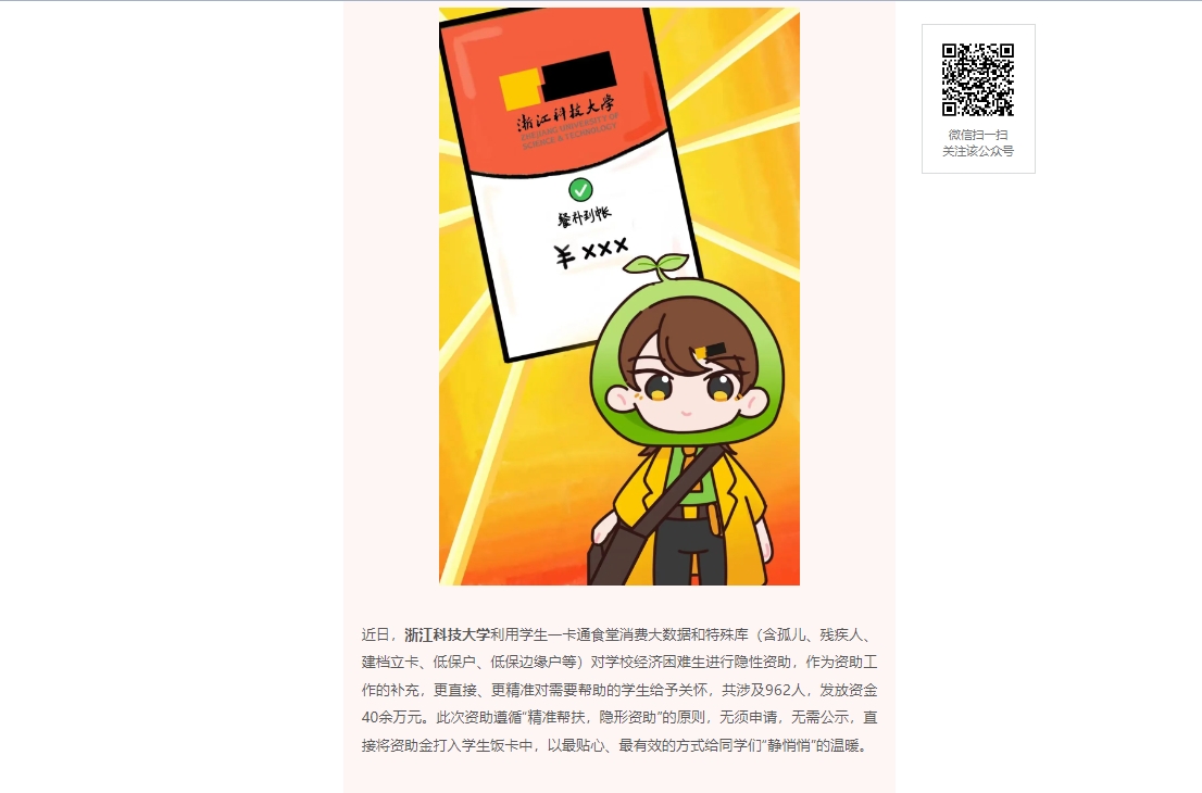近日,米乐mile体育官网利用学生一卡通食堂消费大数据和特殊库(含孤儿、残疾人、建档立卡、低保户、低保边缘户等)对学校经济困难生进行隐性资助,作为资助工作的补充,更直接、更精准对需要帮助的学生给予关怀,共涉及962人,发放资金40余万元。此次资助遵循“精准帮扶,隐形资助”的原则,无须申请,无需公示,直接将资助金打入学生饭卡中,以最贴心、最有效的方式给同学们“静悄悄”的温暖。