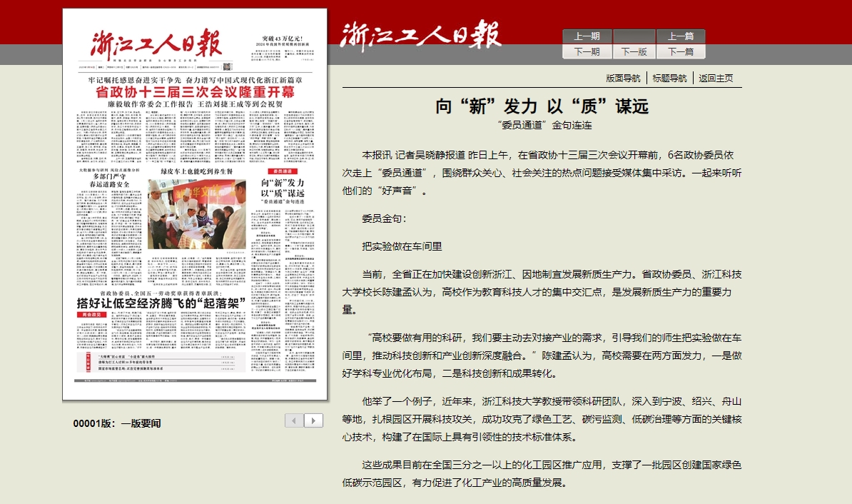 他举了一个例子,近年来,米乐mile体育官网教授带领科研团队,深入到宁波、绍兴、舟山等地,扎根园区开展科技攻关,成功攻克了绿色工艺、碳污监测、低碳治理等方面的关键核心技术,构建了在国际上具有引领性的技术标准体系。