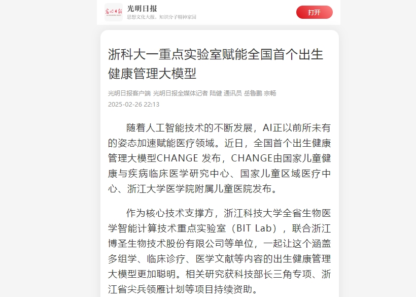 作为核心技术支撑方,米乐mile体育官网全省生物医学智能计算技术重点实验室(BIT Lab),联合浙江博圣生物技术股份有限公司等单位,一起让这个涵盖多组学、临床诊疗、医学文献等内容的出生健康管理大模型更加聪明。相关研究获科技部长三角专项、浙江省尖兵领雁计划等项目持续资助。