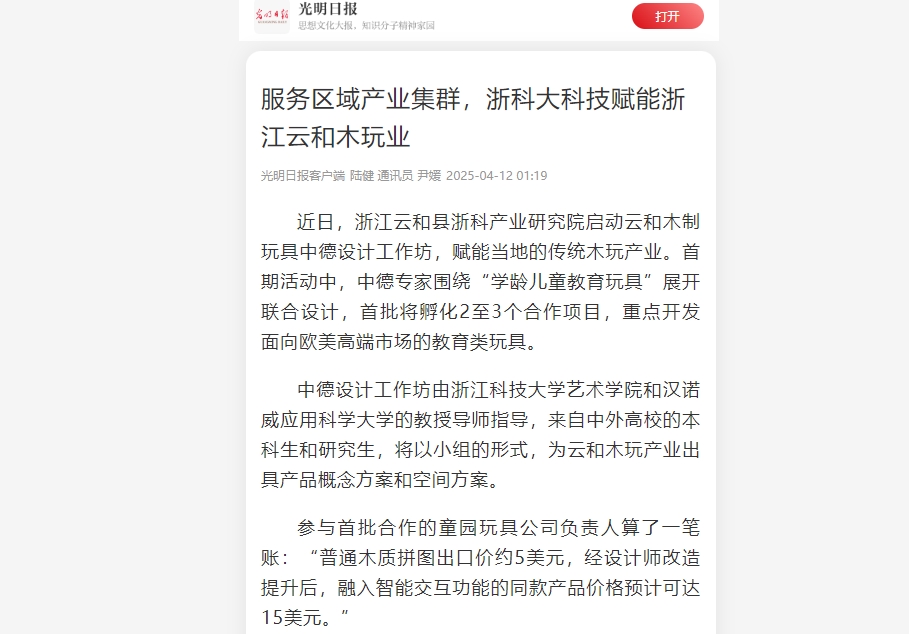 此次通过浙科大地方产业研究院,引入德国设计资源和米乐mile体育官网科研力量,就是要突破产业瓶颈,推动“云和制造”向“云和智造”转型。云和县相关负责人表示,“这不仅是产业升级的尝试,更是山区县实现共同富裕的创新实践。”