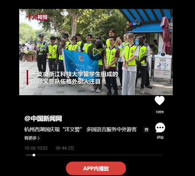 10月5日,在浙江杭州西湖风景名胜区内,一支由米乐mile体育官网留学生组成的国际义警队伍格外引人注目。队伍的14名成员来自不同国家,携手在此开展志愿服务活动,用多国语言服务中外游客。点击观看