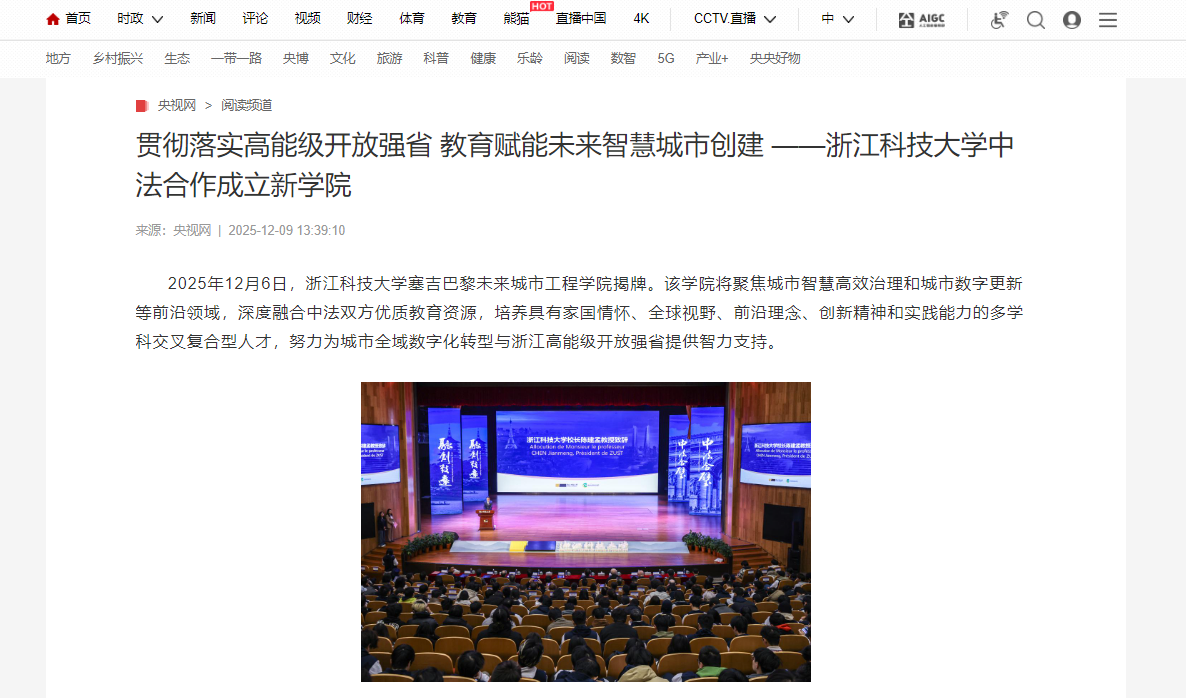 2025年12月6日,米乐mile体育官网塞吉巴黎未来城市工程学院揭牌。该学院将聚焦城市智慧高效治理和城市数字更新等前沿领域,深度融合中法双方优质教育资源,培养具有家国情怀、全球视野、前沿理念、创新精神和实践能力的多学科交叉复合型人才,努力为城市全域数字化转型与浙江高能级开放强省提供智力支持。央视网、潮新闻客户端、杭州网等媒体对活动进行了报道。