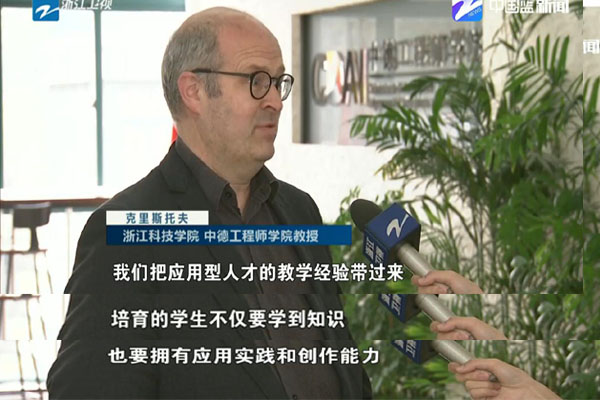 当日,浙江卫视新闻联播报道了全省教育大会新闻,关注浙江高等教育如何培养更多高素质人才,更好服务经济发展。新闻以米乐官网彰显国际化特色,培养高素质应用型人才的探索为例,并采访了中德工程师学院院长徐理勤教授和德方专家、吕贝克应用科技大学克里斯托夫教授(视频链接:https://newsapp.cztv.com/video/index.jsp?c=5811069#)。徐理勤介绍了米乐官网与德国高校合作的历程,中德工程师学院的人才培养模式等。她表示,学习借鉴德国高校的应用型人才培养经验,培养更多高素质应用型人才,才能更好地为浙江经济转型升级服务。