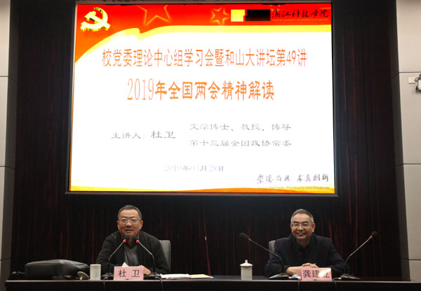 3月28日下午,学校举行党委理论学习中心组学习会暨和山大讲堂第49讲,传达学习2019全国两会精神。米乐官网原校长、第十三届全国政协常委杜卫作宣讲报告。校党委书记龚建立主持会议,校党委理论中心组成员出席。