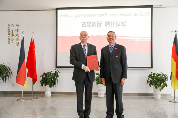 葛策发表了热情洋溢的致辞。他首先表示,非常荣幸受邀来浙江科技学院参观访问,并受聘为浙江科技学院名誉教授。葛策说,德国工业技术的发展离不开高层次应用型人才的培养,应用科学大学功不可没。他很高兴看到浙江科技学院与德国应用科学大学之间有着悠久的合作历史、大范围的合作领域、深层次的合作项目、以及丰硕的合作成果,在两国教育、科技和文化方面的合作发挥引领作用。葛策认为,中德两国需要进一步加强人才教育的合作来面对未来的挑战,两国工业和经济能否取得成功在很大程度上取决于像浙江科技学院这样的示范性应用型高校的努力。他期待浙江科技学院在中德两国教育合作方面发挥更大作用,为未来中德两国社会经济发展注入强大推动力。葛策最后感谢学校将中德合作馆作为中德合作成果的窗口和友好关系的象征,向大众开放展示。