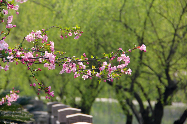 后勤服务部高玉琴老师和记者介绍,“现在这个季节,我们学校的景色不比西湖景区差,该有的我们这里都有。”小和山校区内有一条活水湖——西蜜湖,湖的两边一株杨柳一株桃,与苏堤布局一样,间隔8米。“现在来看,柳树发芽了,桃花盛开了,还能看到海棠花。”如果想再长些知识,大家进门的时候可以看到校门口两侧的银杏。“现在正是爆嫩芽的季节,与秋天黄叶的景象完全不同。”