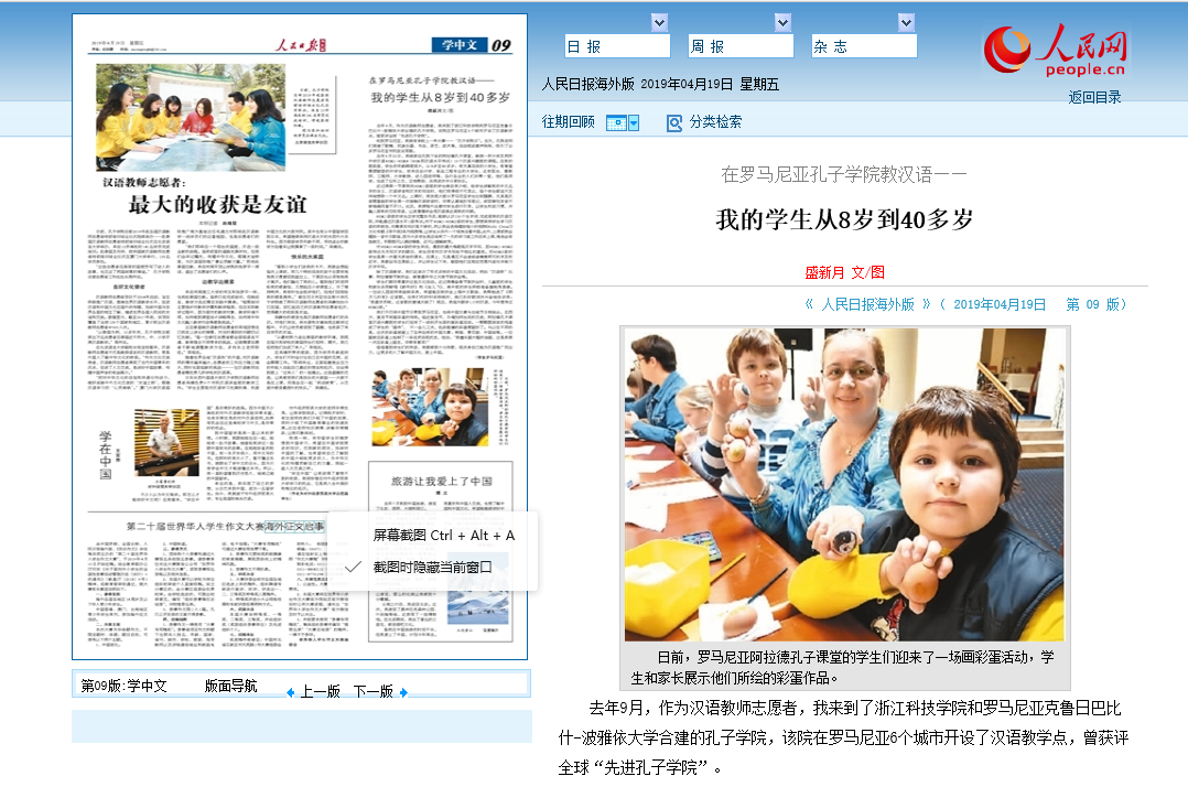4月19日出版的人民日报海外版刊登《在罗马尼亚孔子学院教汉语——我的学生从8岁到40多岁》一文,这是米乐官网罗马尼亚克鲁日孔院教师志愿者盛新月(上图二中)根据自己从事孔院志愿者工作的经历所写的。盛新月是米乐官网16级汉语国际教育专业硕士,2017年7通过国家汉办选拔赴印尼八华学校(印尼最大的三语国际学校)担任志愿者,去年9月前往克鲁日孔子学院任汉语教师。