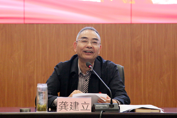 龚建立指出,进入新时代,建设高等教育强国,更需要我们在不忘初心、牢记使命中,寻找指引我们继续前行的不竭动力。高等教育发展方向要同我国发展的现实目标和未来方向紧密联系在一起,为人民服务,为中国共产党治国理政服务,为巩固和发展中国特色社会主义制度服务,为改革开放和社会主义现代化建设服务。结合学校发展实际,他深入阐述学校如何准确把握并践行“四个服务”必须始终将立德树人作为办学之根本,必须将学校发展融入国家战略和地方发展作为重大使命,必须把坚持党对高校的全面领导作为根本保证。