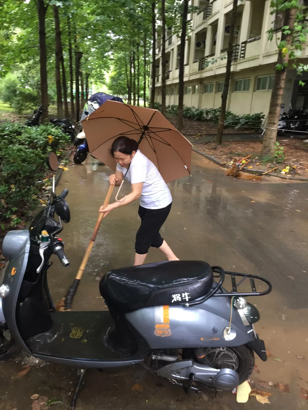 陈静清,是西和公寓9幢宿管阿姨。看到天气预报,她十分担忧,西和公寓地势较低,容易引发积涝,她所负责9幢更为明显,一到下雨天门口就容易“水淹”影响师生出行,她还担心,雨太大,积水过审深,楼宇内的公用设施被水浸泡后还会损坏。8日一早,陈静清就火急火燎开始张贴台风提示、逐层检查宿舍,帮助暑期留宿同学将阳台上、窗台上的物品移至室内;提醒同学们关闭宿舍门窗,防止因台风导致玻璃破碎。9日晚开始,台风带来的强降雨使9幢门口很快变成“一片汪洋”。时刻关注着“水情”的陈静清,每隔一小会就去清扫积水、疏通窨井下水口,一直持续到深夜。第二天一早,天还蒙蒙亮,她又开始清扫工作。当过往的学生对陈阿姨表达感谢时,她笑着说:“这只是分内之事。”