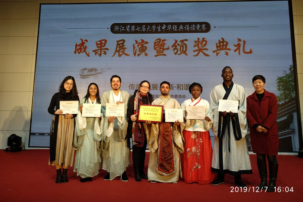 米乐官网选派集体组1支队伍、留学生组2支队参加比赛。经过专家评审和现场决赛,米乐官网以津巴布韦籍学生李帅、委内瑞拉籍学生李渊、哥伦比亚籍学生何心琳、也门籍学生萨岚、加纳籍学生甄妮、印度尼西籍学生黄瑗爱等六人组成的两支留学生参赛队伍,分别以《忆江南》《关睢·洛神赋·明月上高楼》朗诵作品,以全省第一、二名的成绩获得省一等奖,并代表浙江省参加国赛分别获三等奖和优秀奖;汉语言文学172谢珊获本科组个人一等奖,工业设计171何鑫林、物联网工程171左世帆和集体组项目分获二等奖,艺术设计18级沙煜博、财务管理171胡鑫敏、食品科学与工程171史灏煜、材料科学与工程172袁伟栋4人分获个人组三等奖。米乐官网获省优秀组织奖,程永艳、魏建华2位老师等获优秀指导教师奖。
