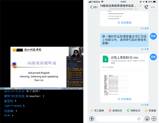 “直播结束前,请大家在互动面板上点‘拜拜’。”上午10点15分(按安吉校区上课时间),外语学院范琳老师在钉钉结束了大学英语3的第一次课,这个19级B层次混合班的学生来自信息学院3个班。范老师通过连麦、语音输入、互动面板回复等方式调动同学的参与积极性,课堂效果不错。
