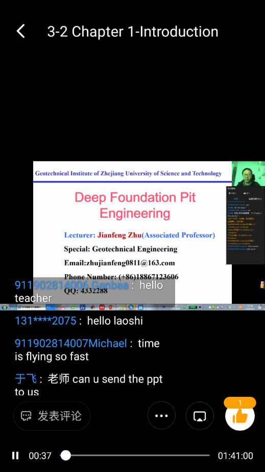 教学班总共8名学生全员到齐,其中4名留学研究生在中国,4名留学研究生在国外,下午1点半,建工学院朱剑锋博士的全英文“Deep Foundation Pit Engineering(深基坑工程)”课程在钉钉开始直播,面向2019级土木工程来华留学研究生,授课主要内容是了解深基坑工程的基本概念,基坑支护形式和功能、基坑支护形式适用条件和工程案例。