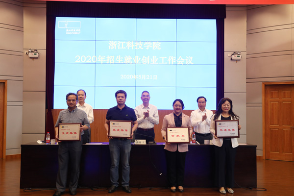 校党委副书记周加敏宣读《浙江科技学院关于表彰2019年毕业生就业工作先进集体和先进个人的通报》。校领导为获表彰的集体和个人代表颁奖。