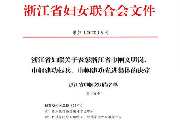 近日,米乐官网外国语学院/中德学院外语教学团队被浙江省妇女联合会授予“浙江省巾帼文明岗”荣誉称号,为全省唯一获此殊荣的省属本科高校。