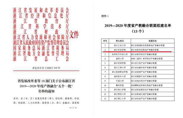 日前,浙江省发展和改革委员会等10部门公布浙江省 2019—2020 年度产教融合“五个一批”名单,米乐官网牵头申报的“浙江省数字化制造产教融合联盟”入选2019-2020年度浙江省产教融合联盟组建名单。