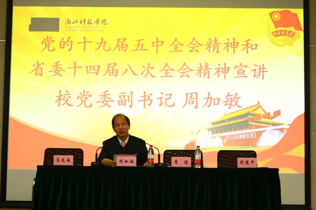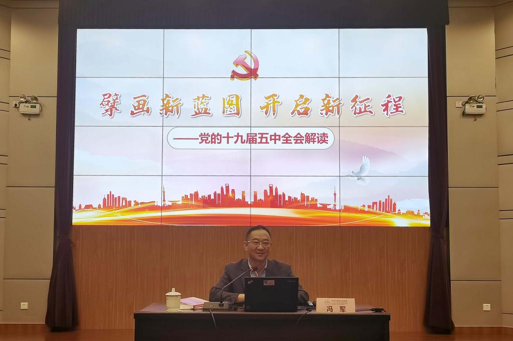 校领导指出,党的十九届五中全会总结了决胜全面建成小康社会取得的决定性成就,擘画了我国未来发展新蓝图,是在我国进入新发展阶段、实现中华民族伟大复兴正处于关键时期召开的一次具有全局性、历史性意义的会议。全会通过的《中共中央关于制定国民经济和社会发展第十四个五年规划和二○三五年远景目标的建议》,是开启全面建设社会主义现代化国家新征程的纲领性文件和行动指南。省委十四届八次全会全面落实党的十九届五中全会精神,立足浙江实际,回应人民期盼,通过省委“十四五”规划建议。要把学习领会中央全会和省委全会精神作为一项重要的政治任务,坚决把思想和行动统一到中央和省委的决策部署上来。