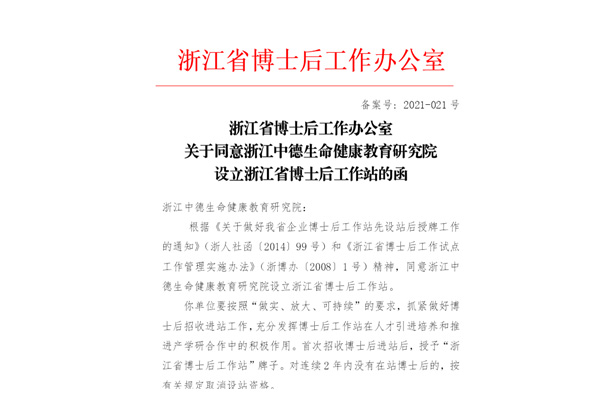 近日,浙江中德生命健康教育研究院获得省博士后工作办公室批准,成功设立米乐官网首个博士后工作站。