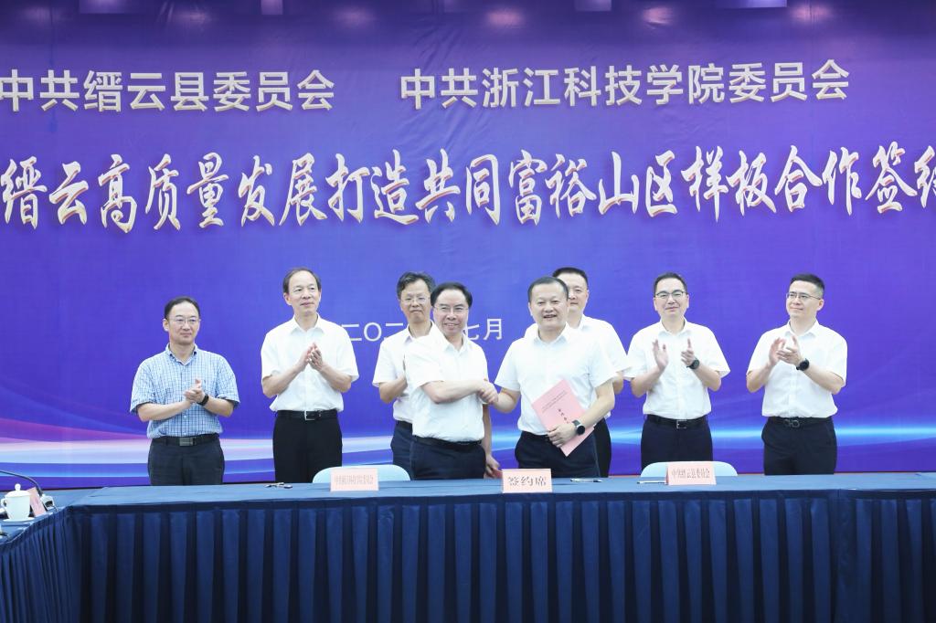 签约仪式上,中共缙云县委员会与中共浙江科技学院委员会签订《党建统领缙云高质量发展打造共同富裕山区样板合作备忘录》。