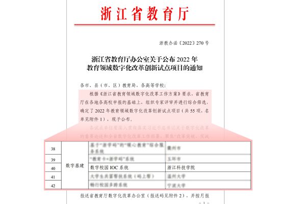 近日,浙江省教育厅公布2022年教育领域数字化改革创新试点项目名单,米乐官网申报的“数字校园IOC系统”项目入选试点项目名单。