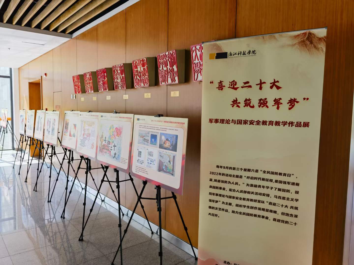 “没想到,国防教育这么严肃的主题还能用这么活泼的形式表达。”9月17日是第22个全民国防教育日,一场主题展览在安吉校区展出。一件件富有创意、立意深远的展示作品都是“军事理论与国家安全教育”课的学生作业成品。这场以“喜迎二十大 共筑强军梦”为主题的展览,由马克思主义学院、人武部主办,军事理论与国家安全教育教研室承办,集中展示同学们创作的海报、手抄版、短文、诗歌等作品。