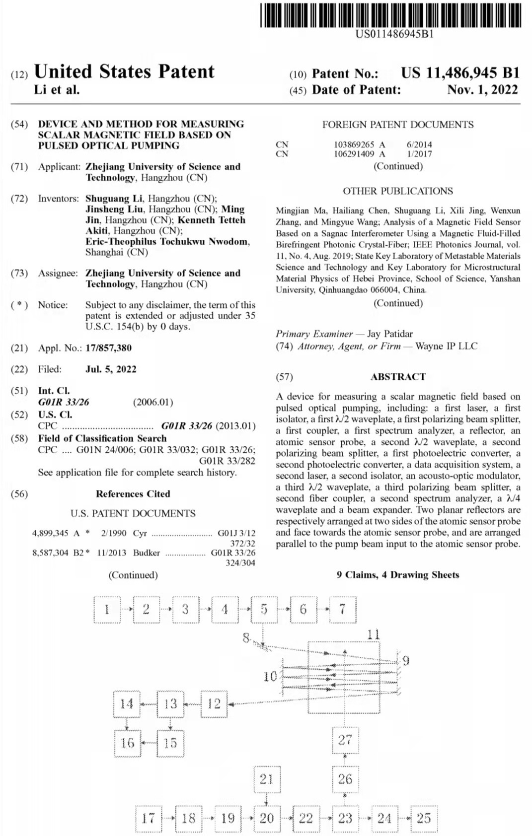 近日,自动化与电气工程学院光学精密测量团队在极弱场测量前沿领域的创新技术“基于脉冲光学泵浦的标量磁场测量装置与方法(Device and method for measuring scalar magnetic field based on pulsed optical pumping)”取得重要突破,获得由美国专利局与商标局(USPTO)颁发的美国发明专利授权。其中李曙光副教授是第一发明人,电气学院机器人与智能控制方向研究生刘金生、金铭,以及智能制造与控制工程的留学生研究生Kenneth Akiti、Eric Nwodom为共同发明人。据悉,光学精密测量团队前期阶段的前沿研究成果发表在测量领域的国际高水平期刊《Measurement》上。