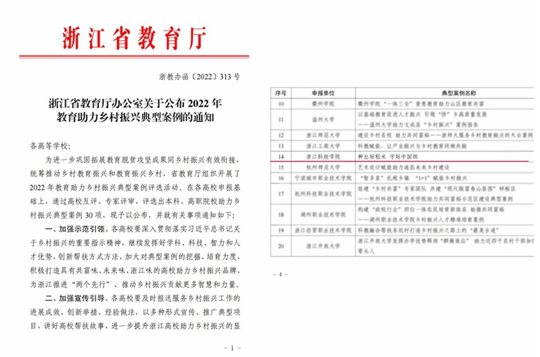 近日,浙江省教育厅办公室公布2022 年教育助力乡村振兴典型案例的评选结果,学校报送的《种出好稻米,守好中国田——浙江科技学院教师科技助力青田农村发展》成功入选典型案例。