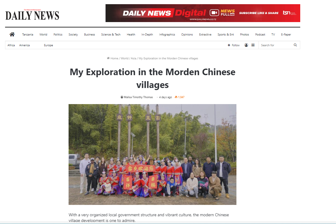 近日,米乐官网坦桑尼亚籍国际学生Malisa Timothy Thomas在坦桑尼亚主流英文报纸《每日新闻》(Daily News)发表文章《感知中国现代化农村》(点击阅读),讲述自己赴杭州市富阳区新登镇双江村和上山村参加“感知中国”社会实践课程的感受和体会。